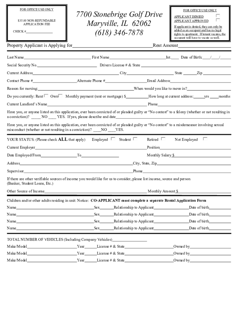 FOR OFFICE USE ONLY $35.00 NONREFUNDABLE APPLICATION FEE CHECK #Property Applicant is Applying forAPPLICANT DENIED APPLICANT APPROVED If applicant is denied, they can only be added as an occupant