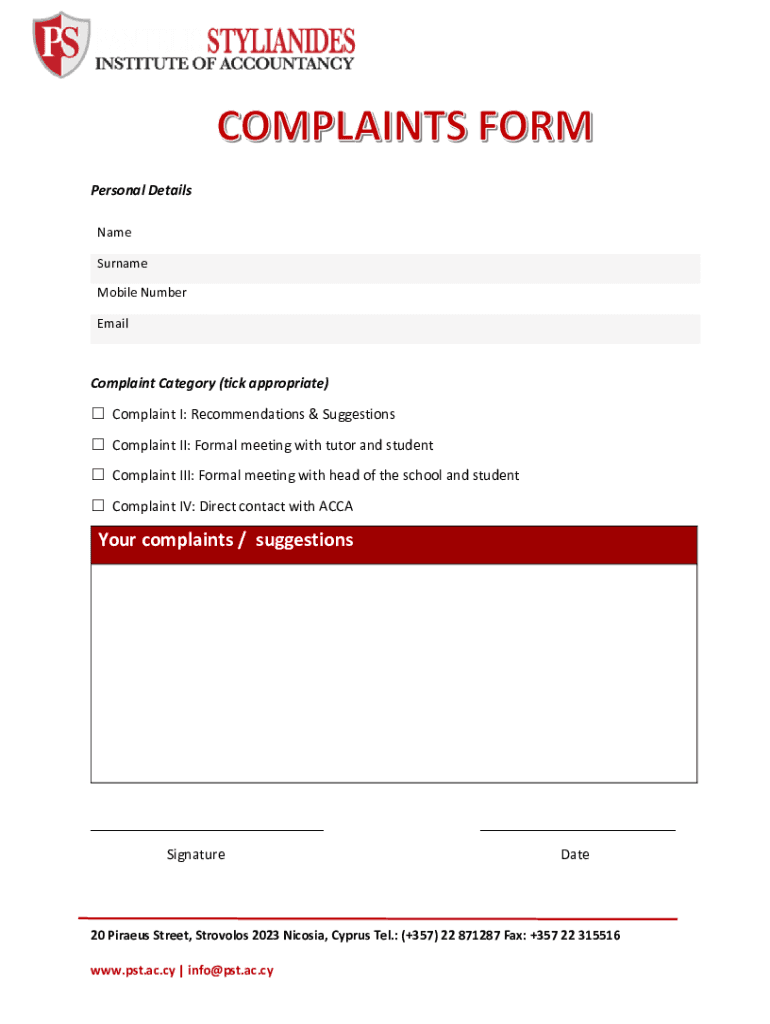 Personal Details Name Surname Mobile Number EmailComplaint Category (tick appropriate) Complaint I: Recommendations & Suggestions Complaint II: Formal meeting with tutor and student Complaint III: