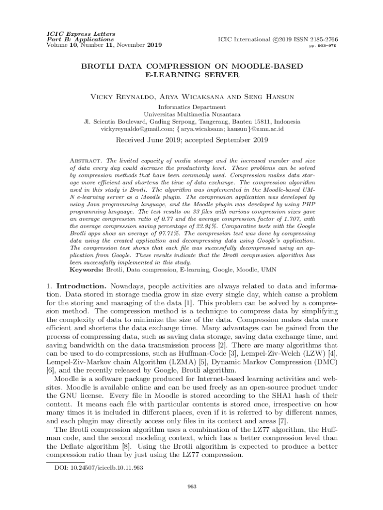 ICIC Express Letters Part B: Applications Volume 10, Number 11, November 2019c ICIC International 2019 ISSN 21852766 pp. 963970BROTLI DATA COMPRESSION ON MOODLEBASED ELEARNING SERVER Vicky Reynaldo,