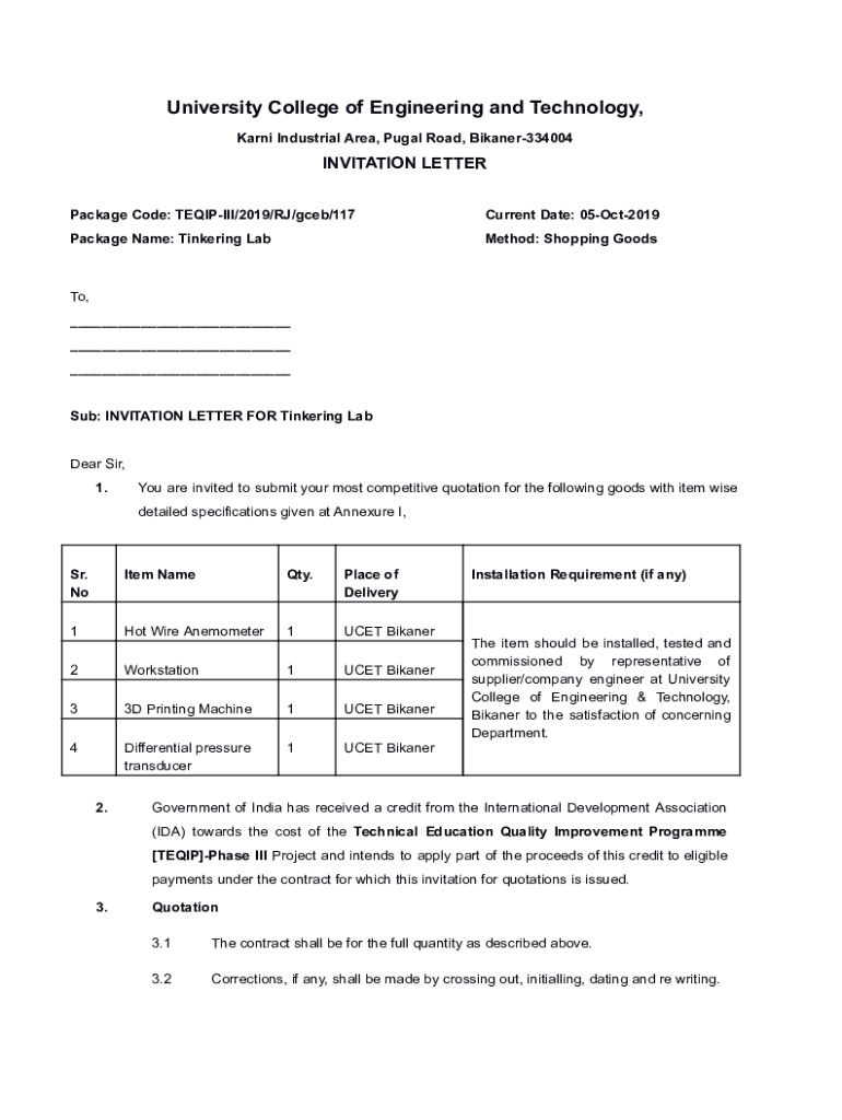 University College of Engineering and Technology, Karni Industrial Area, Pugal Road, Bikaner334004INVITATION LETTER Package Code: TEQIPIII/2019/RJ/gceb/117Current Date: 05Oct2019Package Name: Tinkering