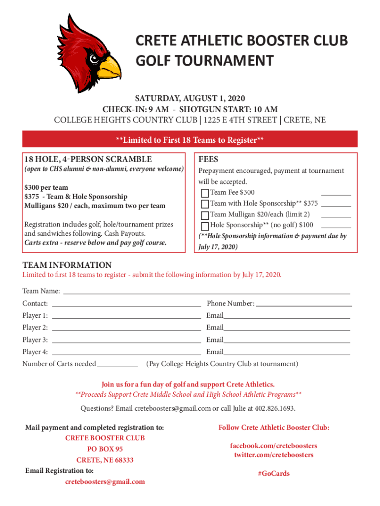 CRETE ATHLETIC BOOSTER CLUB GOLF TOURNAMENT SATURDAY, AUGUST 1, 2020 CHECKIN: 9 AM SHOTGUN START: 10 AM COLLEGE HEIGHTS COUNTRY CLUB | 1225 E 4TH STREET | CRETE, NE **Limited to First 18 Teams to