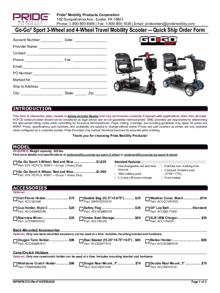 Pride Mobility Products Corporation 182 Susquehanna Ave., Exeter, PA 18643 Phone: 18008008586 | Fax: 18008001636 | Email: prideorders@pridemobility.comGoGo Sport 3Wheel and 4Wheel Travel Mobility