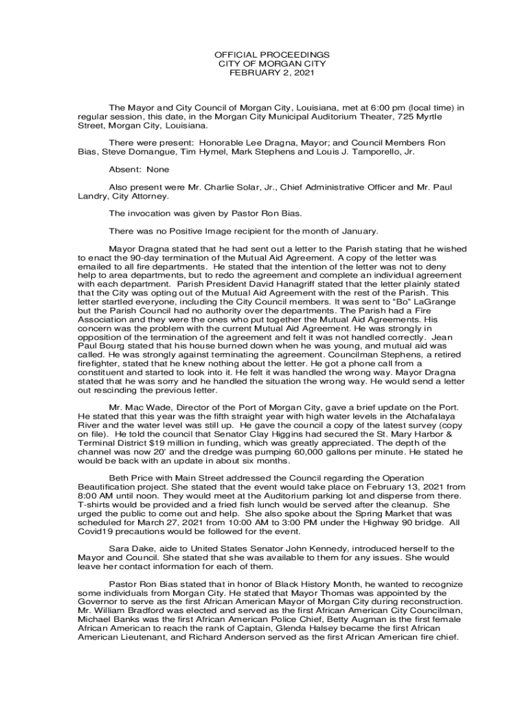 OFFICIAL PROCEEDINGS CITY OF MORGAN CITY FEBRUARY 2, 2021The Mayor and City Council of Morgan City, Louisiana, met at 6:00 pm (local time) in regular session, this date, in the Morgan City Municipal