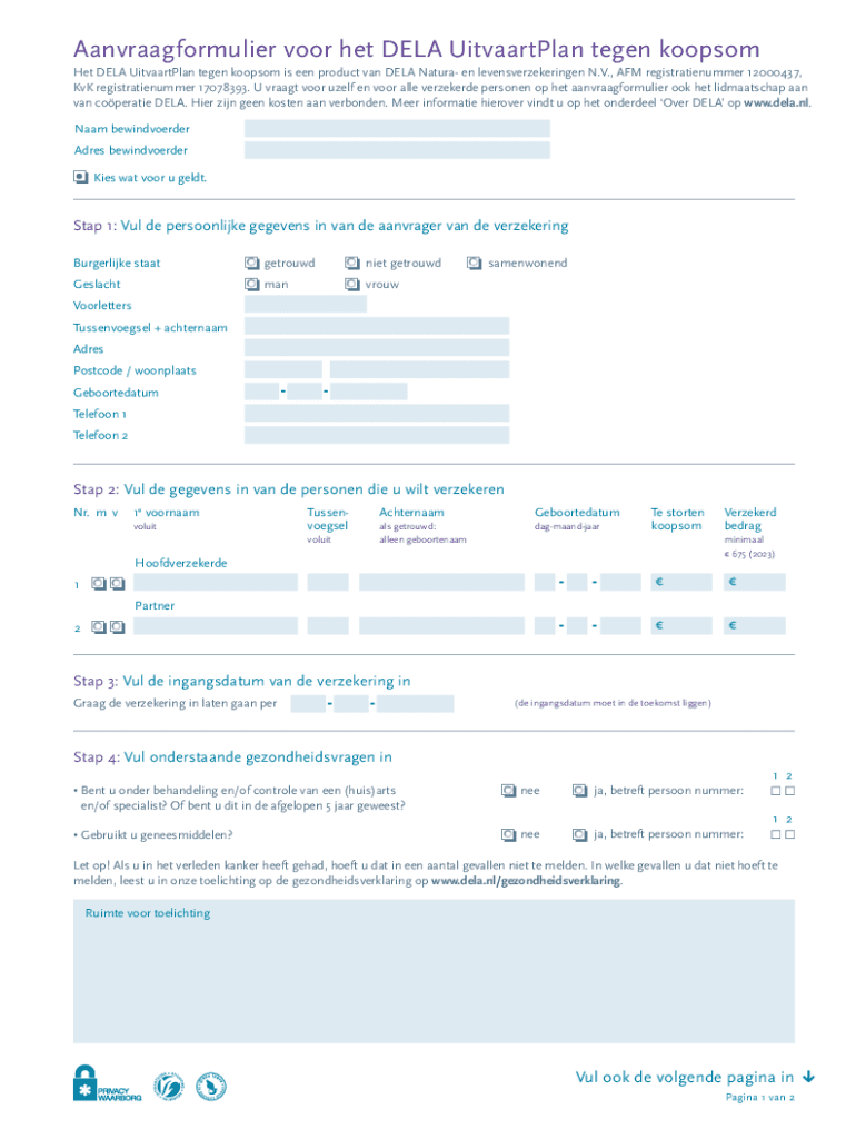 Aanvraagformulier voor het DELA UitvaartPlan tegen koopsom Het DELA UitvaartPlan tegen koopsom is een product van DELA Natura en levensverzekeringen N.V., AFM registratienummer 12000437, KvK registratienummer