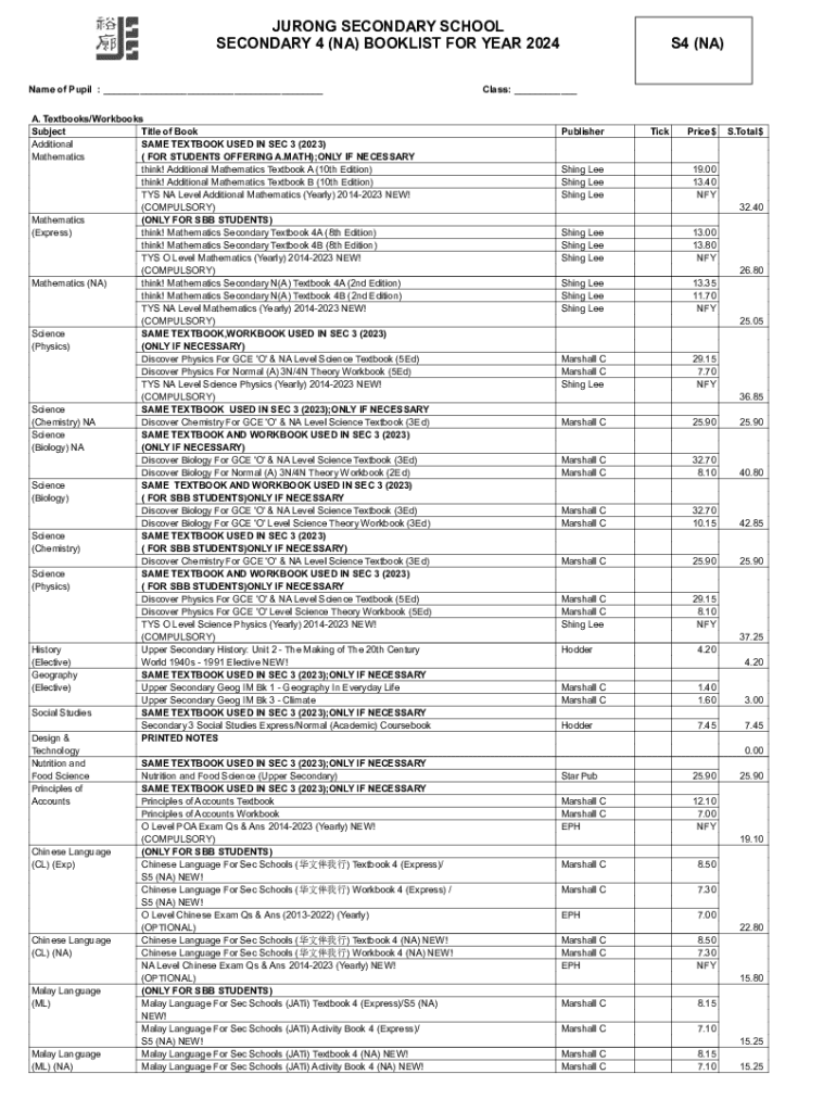 SECONDARY 4 (NA) BOOKLET FOR YEAR 2024