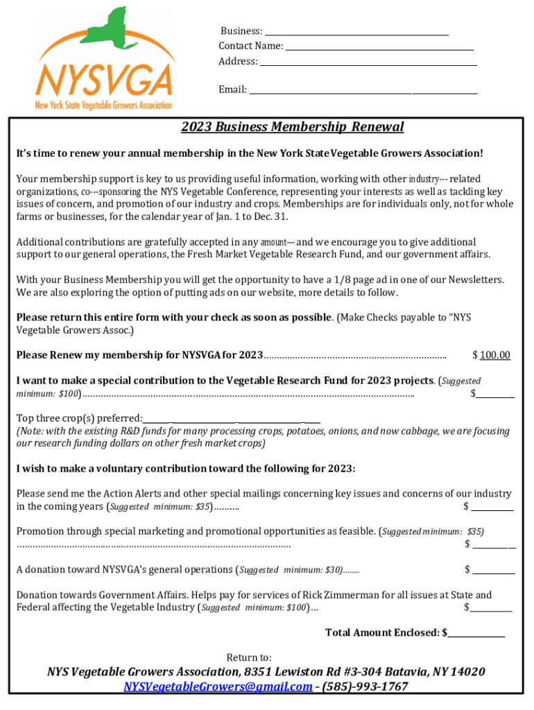 Business: ___ Contact Name: ___ Address: ___ Email: ___2023 Business Membership Renewal Its time to renew your annual membership in the New York State Vegetable Growers Association! Your membership