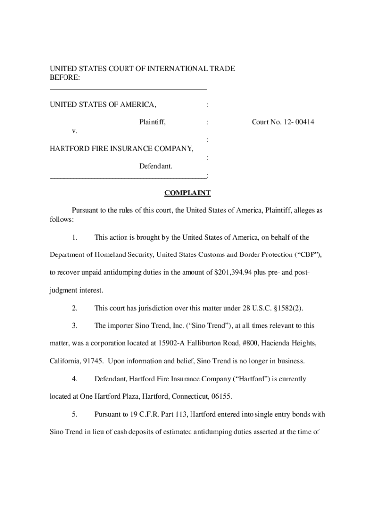 Get the free Hartford Fire Ins. Co. v. United States, No. 07-00067 (Ct. Int' ...