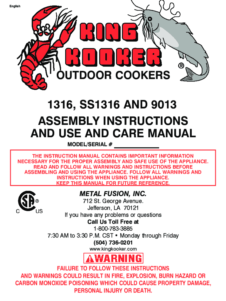 EnglishOUTDOOR COOKERS1316, SS1316 AND 9013 ASSEMBLY INSTRUCTIONS AND USE AND CARE MANUAL MODEL/SERIAL#___THE INSTRUCTION MANUAL CONTAINS IMPORTANT INFORMATION NECESSARY FOR THE PROPER ASSEMBLY AND