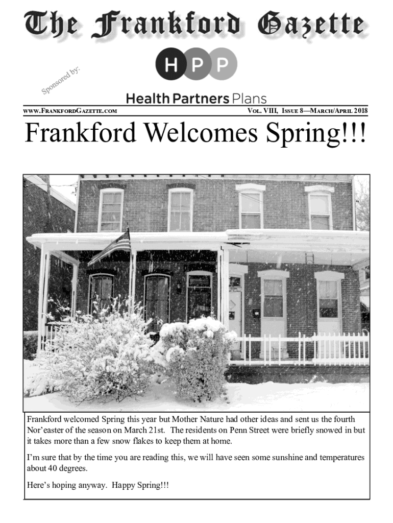 Www.FrankfordGazette.comVol. VIII, Issue 8March/April 2018Frankford Welcomes Spring!!!Frankford welcomed Spring this year but Mother Nature had other ideas and sent us the fourth