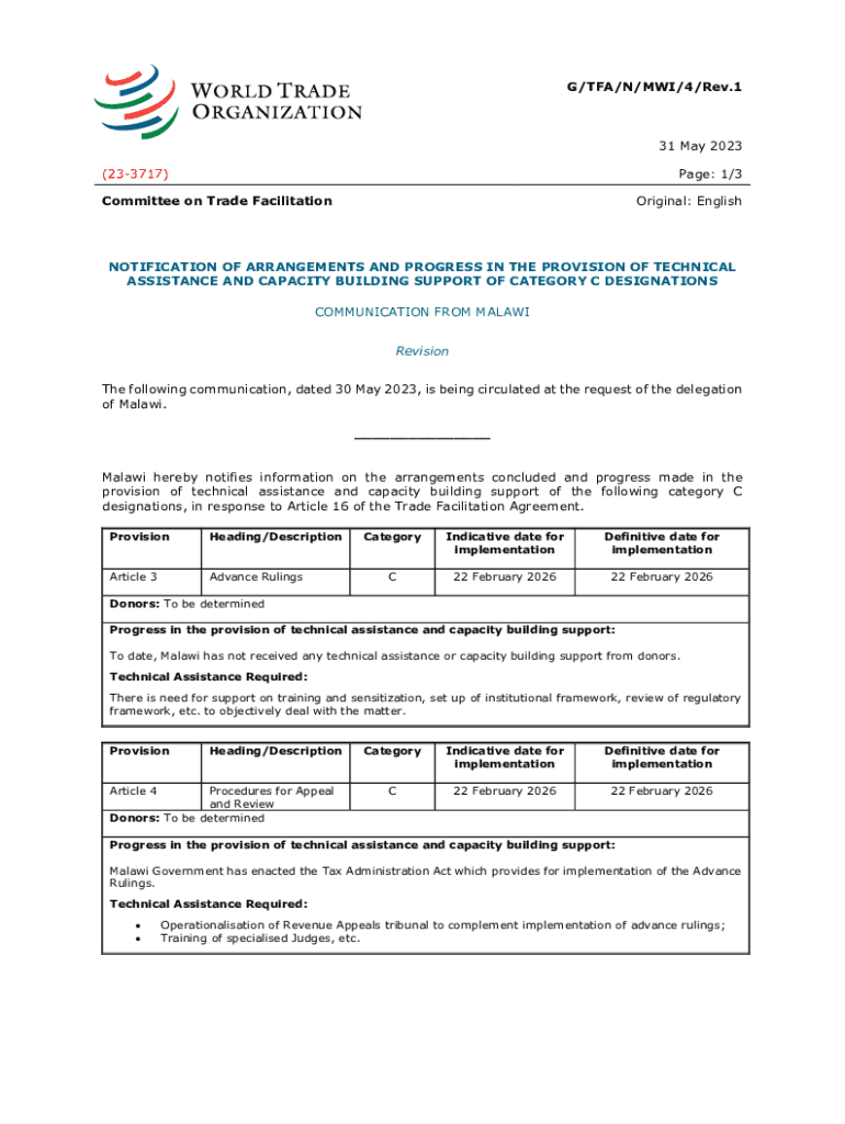 G/TFA/N/MWI/4/Rev.131 May 2023 (233717)Page: 1/3Committee on Trade FacilitationOriginal: EnglishNOTIFICATION OF ARRANGEMENTS AND PROGRESS IN THE PROVISION OF TECHNICAL ASSISTANCE AND CAPACITY BUILDING