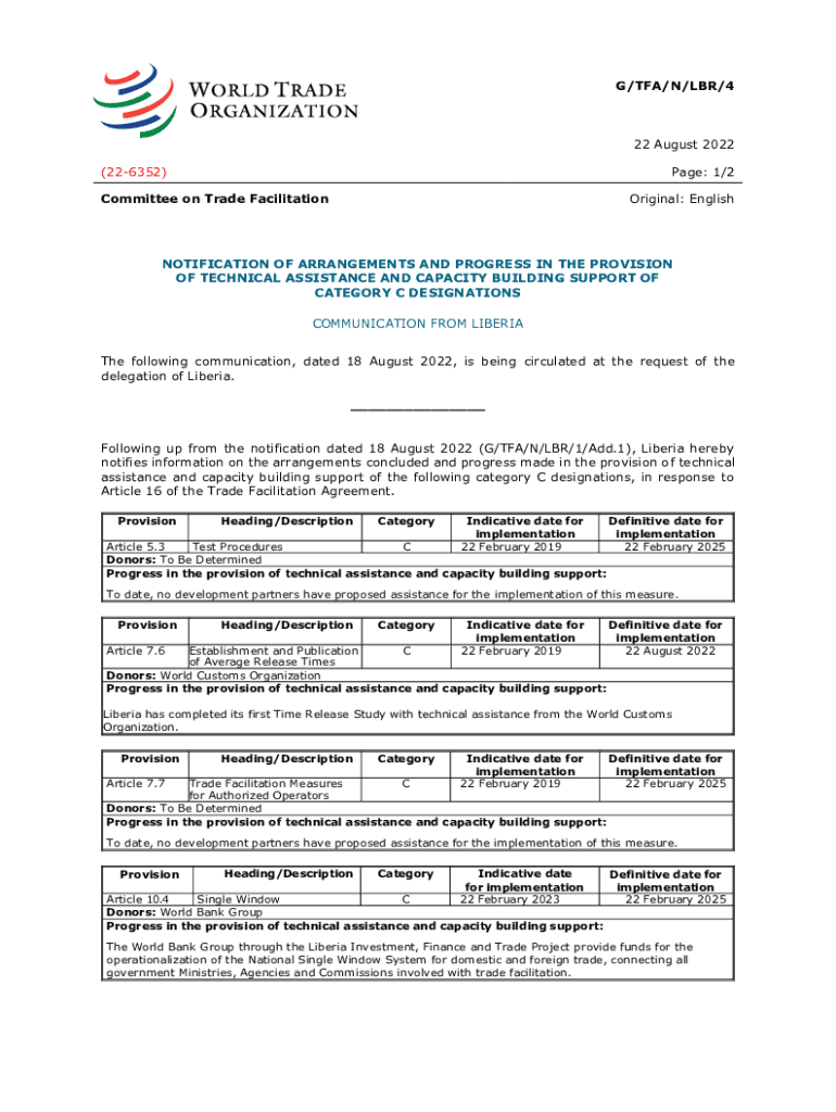 G/TFA/N/LBR/422 August 2022 (226352)Page: 1/2Committee on Trade FacilitationOriginal: EnglishNOTIFICATION OF ARRANGEMENTS AND PROGRESS IN THE PROVISION OF TECHNICAL ASSISTANCE AND CAPACITY BUILDING
