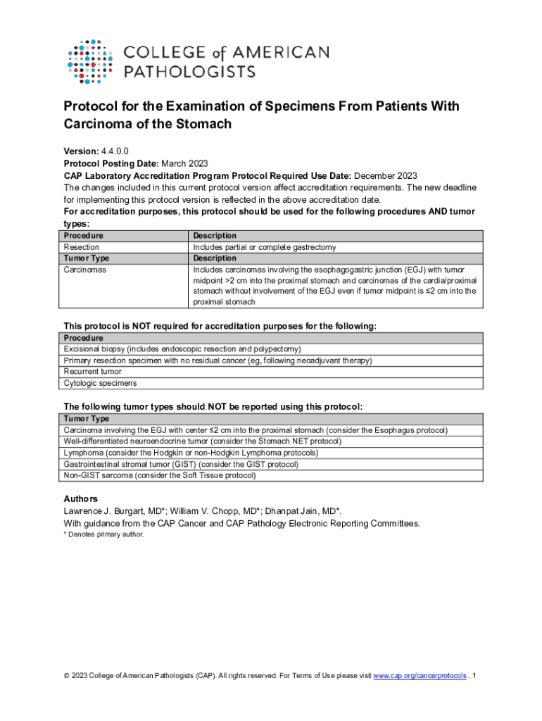 Protocol for the Examination of Specimens From Patients With Carcinoma of the Stomach Version: 4.4.0.0 Protocol Posting Date: March 2023 CAP Laboratory Accreditation Program Protocol Required Use