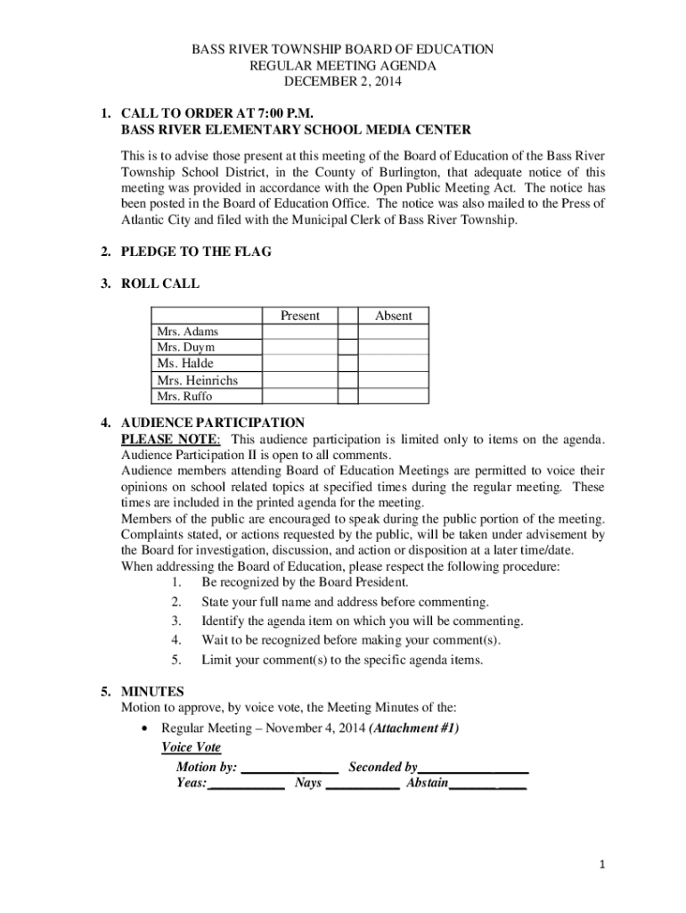 BASS RIVER TOWNSHIP BOARD OF EDUCATION REGULAR MEETING AGENDA DECEMBER 2, 2014 1. CALL TO ORDER AT 7:00 P.M. BASS RIVER ELEMENTARY SCHOOL MEDIA CENTER This is to advise those present at this meeting