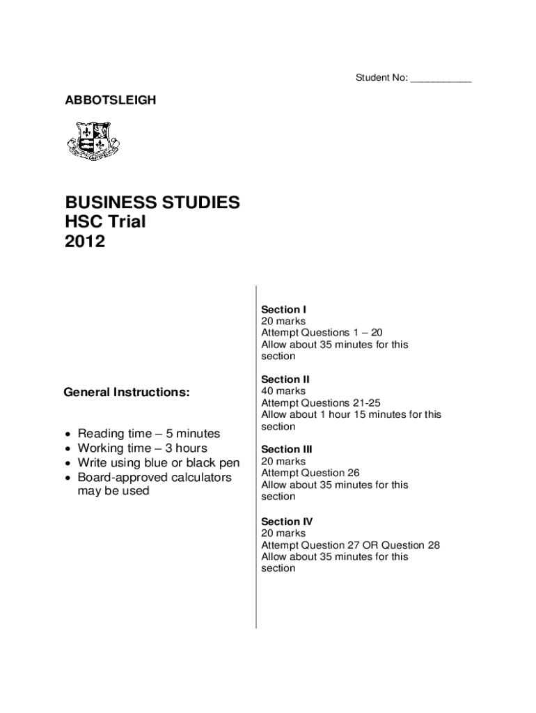 Student No: ___ABBOTSLEIGHBUSINESS STUDIES HSC Trial 2012Section I 20 marks Attempt Questions 1 20 Allow about 35 minutes for this sectionGeneral Instructions: Reading time 5 minutes Working time