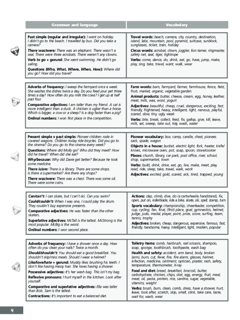4Grammar and languageVocabularyPast simple (regular and irregular): I went on holiday. I didnt go to the beach. I travelled by bus. Did you take a camera? There was/were: There was an elephant. There