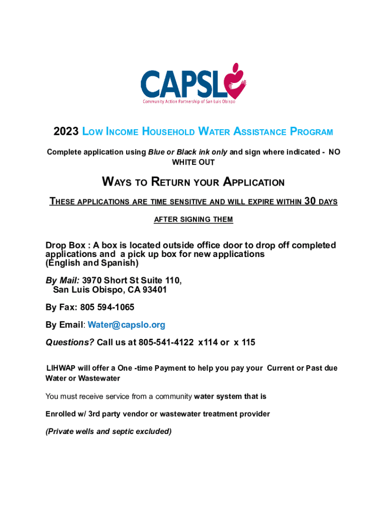2023 LOW INCOME HOUSEHOLD WATER ASSISTANCE PROGRAM Complete application using Blue or Black ink only and sign where indicated NO WHITE OUTWAYS TO RETURN YOUR APPLICATION THESE APPLICATIONS ARE TIME