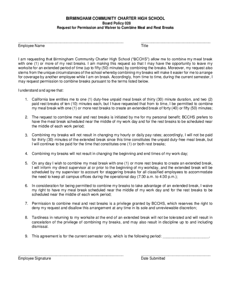 BIRMINGHAM COMMUNITY CHARTER HIGH SCHOOL Board Policy 028 Request for Permission and Waiver to Combine Meal and Rest Breaks___ Employee Name___ TitleI am requesting that Birmingham Community Charter