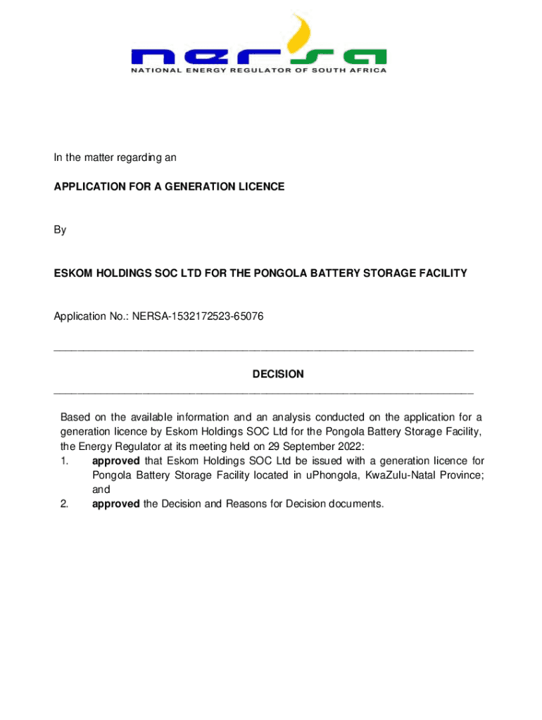 In the matter regarding an APPLICATION FOR A GENERATION LICENCEByESKOM HOLDINGS SOC LTD FOR THE PONGOLA BATTERY STORAGE FACILITYApplication No.: NERSA153217252365076 ___ DECISION ___ Based on the