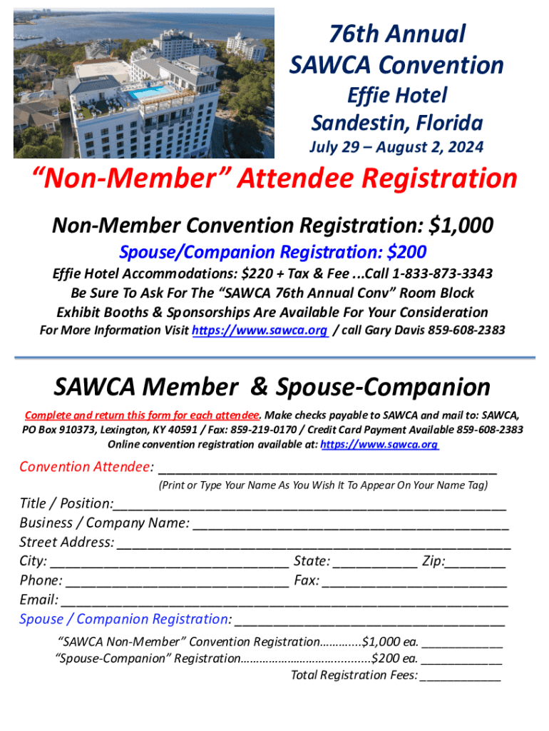 76th Annual SAWCA Convention Effie Hotel Sandestin, FloridaJuly 29 August 2, 2024NonMember Attendee Registration NonMember Convention Registration: $1,000 Spouse/Companion Registration: $200Effie
