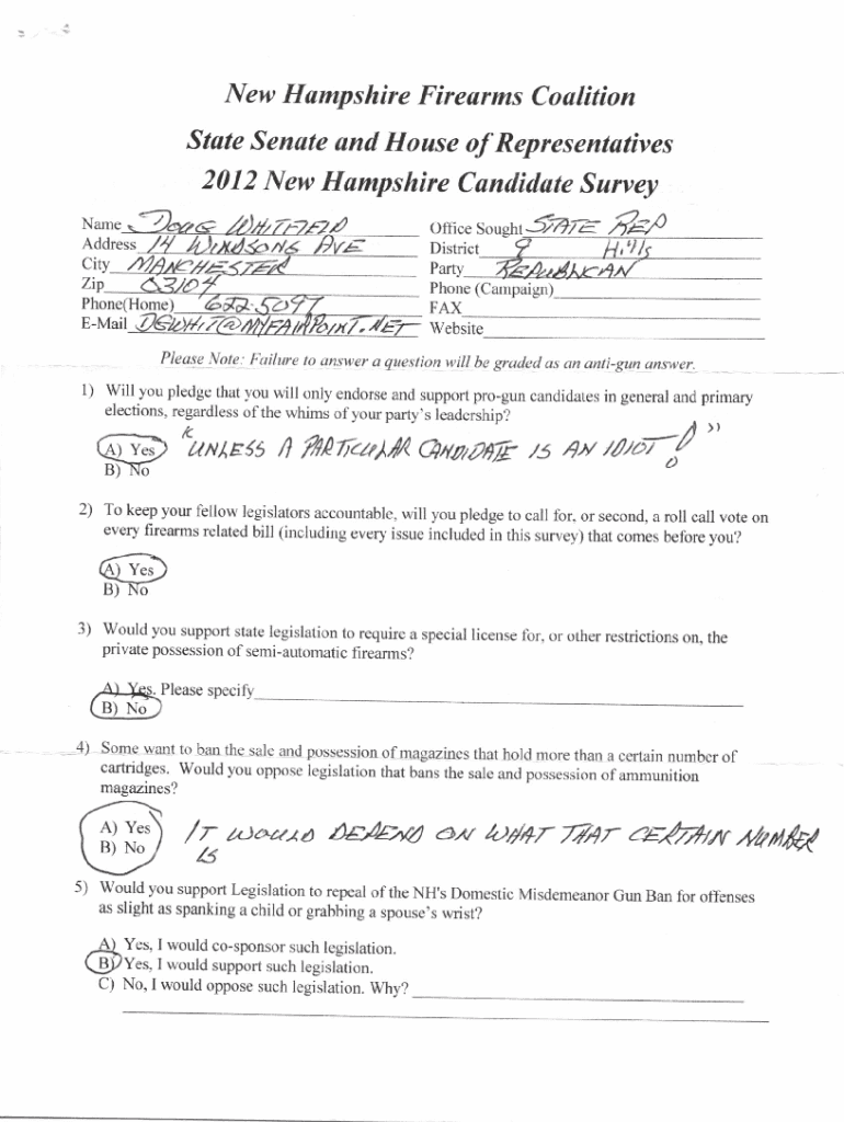 New Hampshire Firearms Coalition Stute Senate and House of Representatives2012 New Hampshire Cuwlidste Survey Name Addressg1Sr\"\"3rruo1r1577VDistrictCityzipParty Phone (Campaign)Phone(HomeFAXEMailWebsite