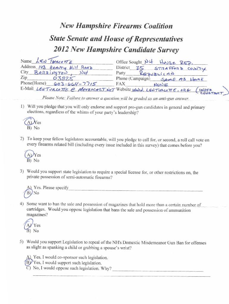 New Hampshire Firearms Coalition Stste Senate and House of Representatives 2012 New Hampshire Condidate Survey N*rr\"krfn*ootofficeSoughtD4Districtzip63F?iPhone(Home) AoA Ac^4 \'7) t g FAX EMail Lt\'foncan\'e