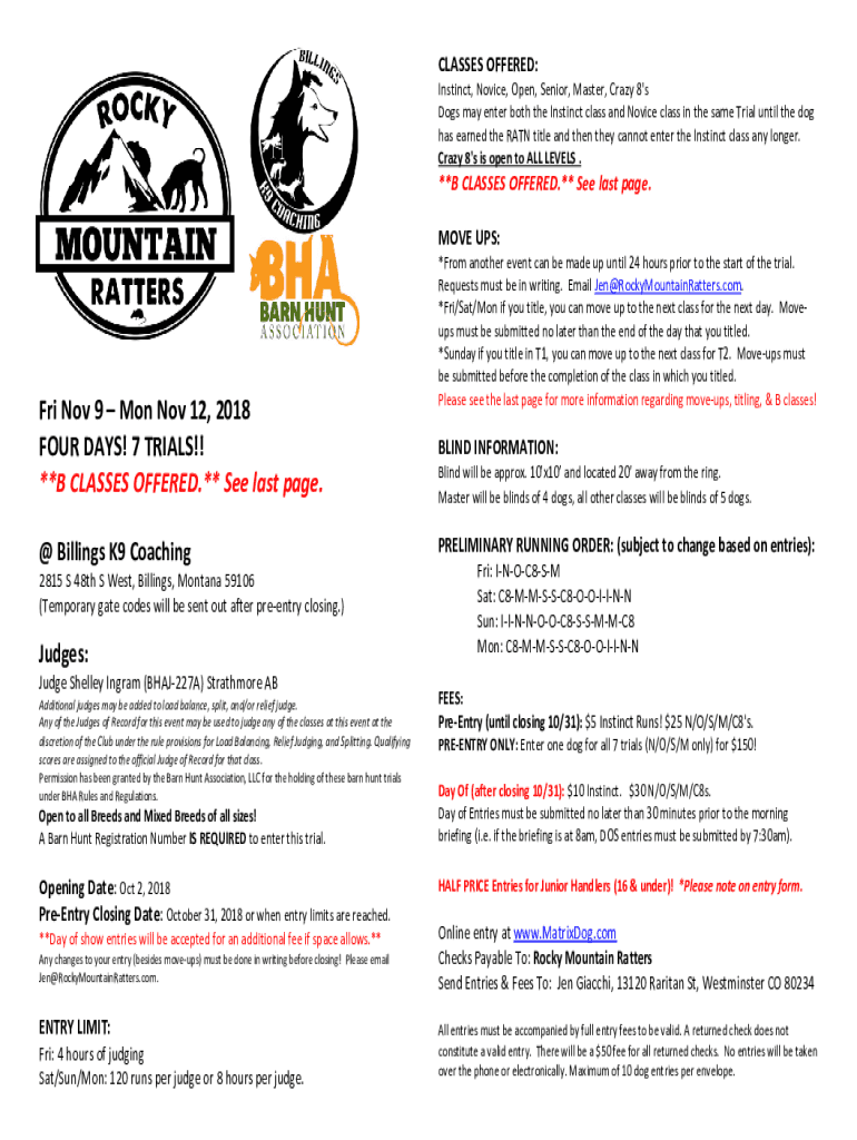 CLASSES OFFERED: Instinct, Novice, Open, Senior, Master, Crazy 8\'s Dogs may enter both the Instinct class and Novice class in the same Trial until the dog has earned the RATN title and then they