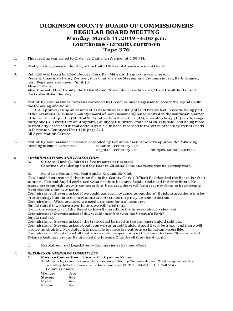 DICKINSON COUNTY BOARD OF COMMISSIONERS REGULAR BOARD MEETING Monday, March 11, 2019 6:00 p.m. Courthouse Circuit Courtroom Tape 3761.The meeting was called to Order by Chairman Wender at 6:00 PM.2.Pledge
