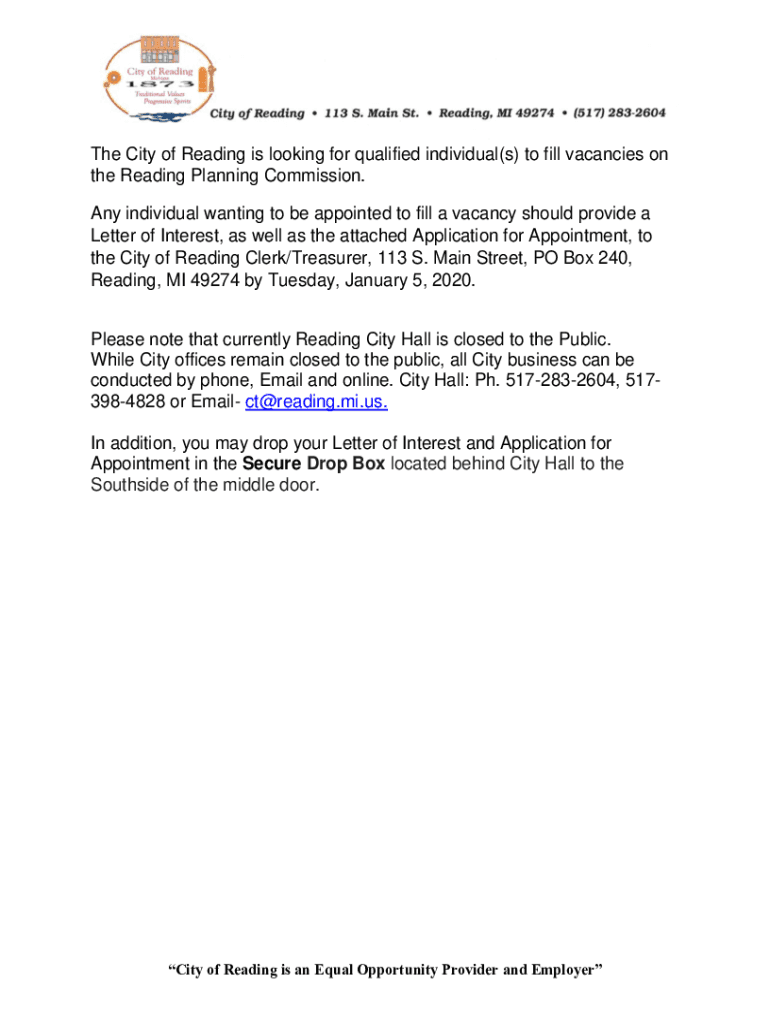 The City of Reading is looking for qualified individual(s) to fill vacancies on the Reading Planning Commission. Any individual wanting to be appointed to fill a vacancy should provide a Letter of