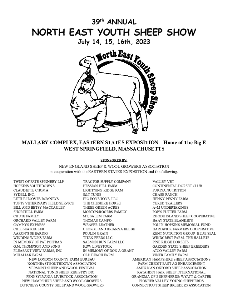 39th ANNUALNORTH EAST YOUTH SHEEP SHOW July 14, 15, 16th, 2023MALLARY COMPLEX, EASTERN STATES EXPOSITION Home of The Big E WEST SPRINGFIELD, MASSACHUSETTS SPONSORED BY:NEW ENGLAND SHEEP & WOOL GROWERS