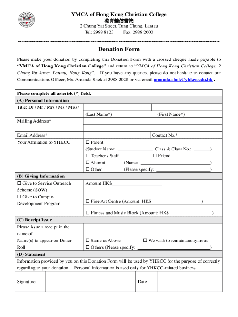 YMCA of Hong Kong Christian College 2 Chung Yat Street, Tung Chung, Lantau Tel: 2988 8123 Fax: 2988 2000Donation Form Please make your donation by completing this Donation Form with a crossed cheque