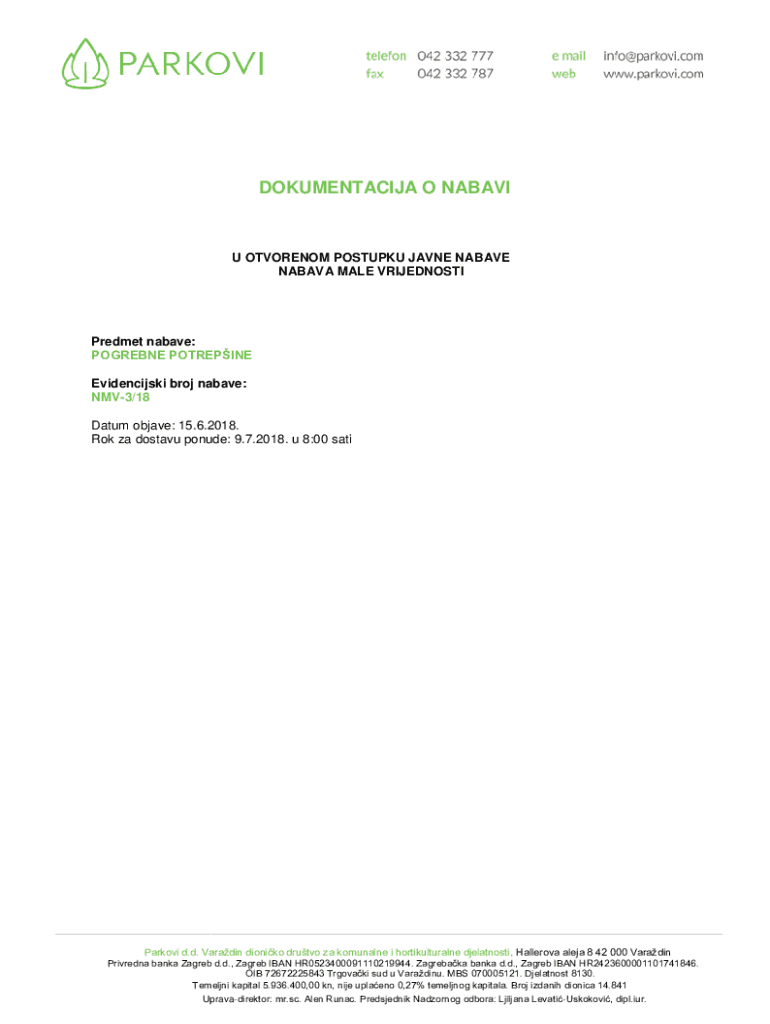 DOKUMENTACIJA O NABAVIU OTVORENOM POSTUPKU JAVNE NABAVE NABAVA MALE VRIJEDNOSTIPredmet nabave: POGREBNE POTREPINE Evidencijski broj nabave: NMV3/18 Datum objave: 15.6.2018. Rok za dostavu ponude: