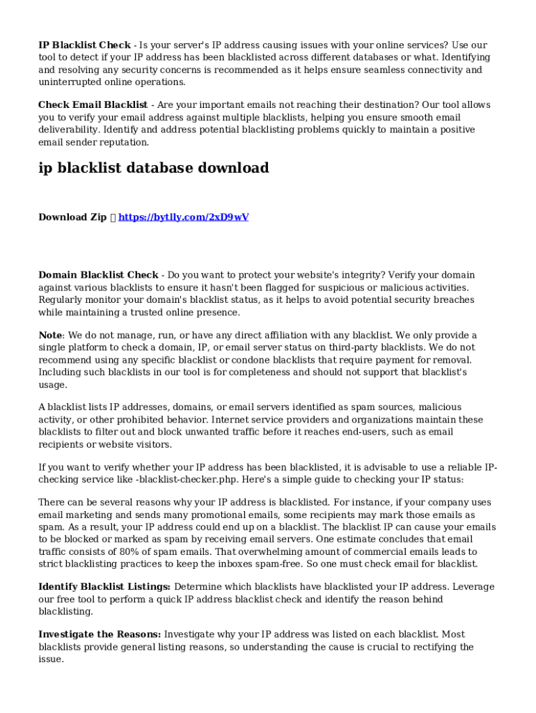 To fill out an IP blacklist check, one needs to provide the IP address in question, along with any required details such as the date of the inquiry and the purpose of the check based on the service provider's guidelines.