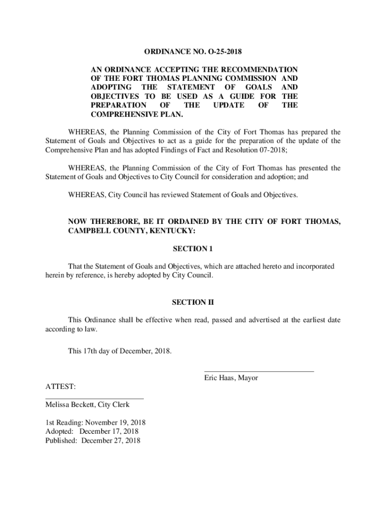 ORDINANCE NO. O252018 AN ORDINANCE ACCEPTING THE RECOMMENDATION OF THE FORT THOMAS PLANNING COMMISSION AND ADOPTING THE STATEMENT OF GOALS AND OBJECTIVES TO BE USED AS A GUIDE FOR THE PREPARATION