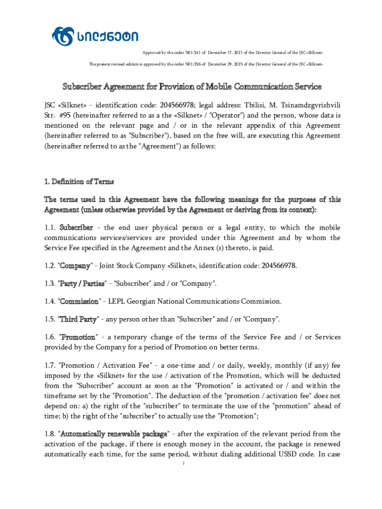 Get the free Subscriber Agreement for Provision of Mobile Communication ...