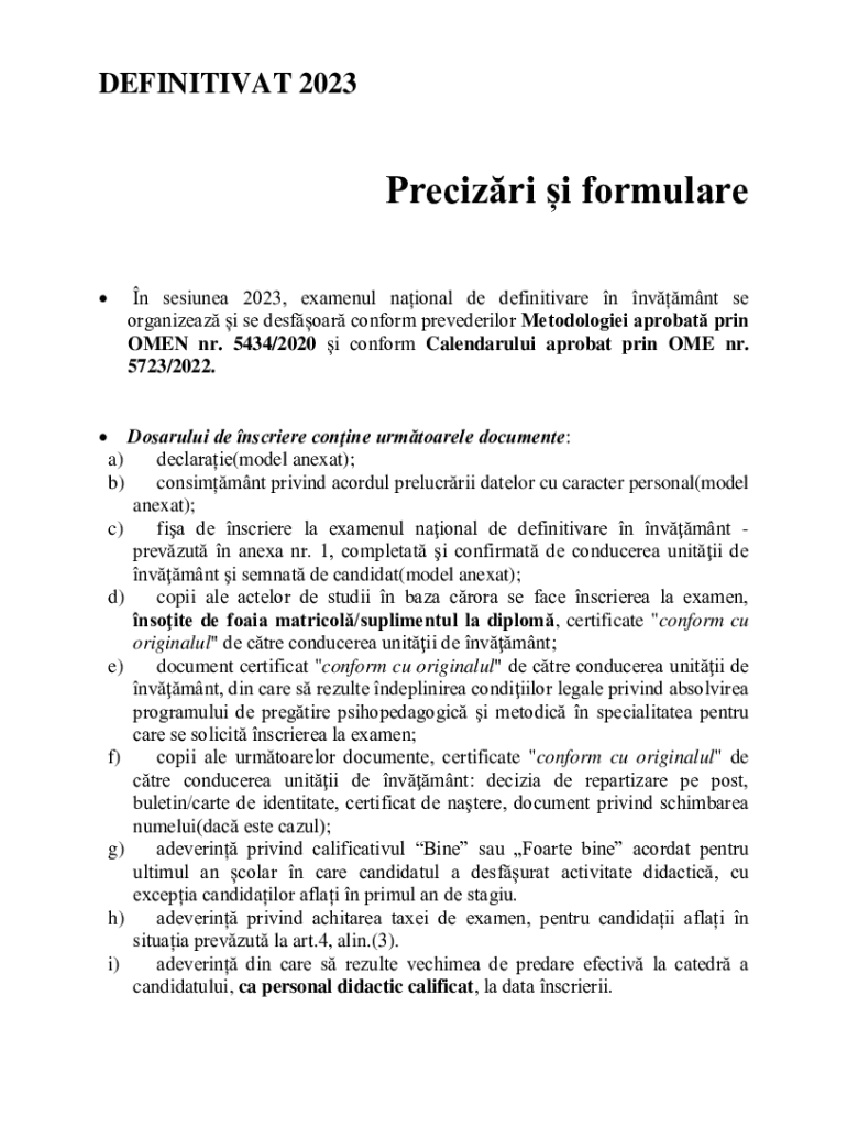 DEFINITIVAT 2023Precizri i formulare n sesiunea 2023, examenul naional de definitivare n nvmnt se organizeaz i se desfoar conform prevederilor Metodologiei aprobat prin OMEN nr. 5434/2020 i conform