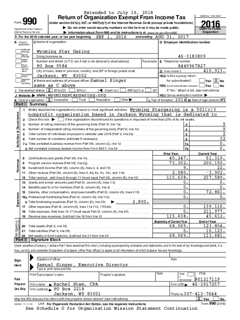 Extended to July 16, 2018 FormReturn of Organization Exempt From Income Tax990OMB No. 154500472016Under section 501(c), 527, or 4947(a)(1) of the Internal Revenue Code (except private foundations)|