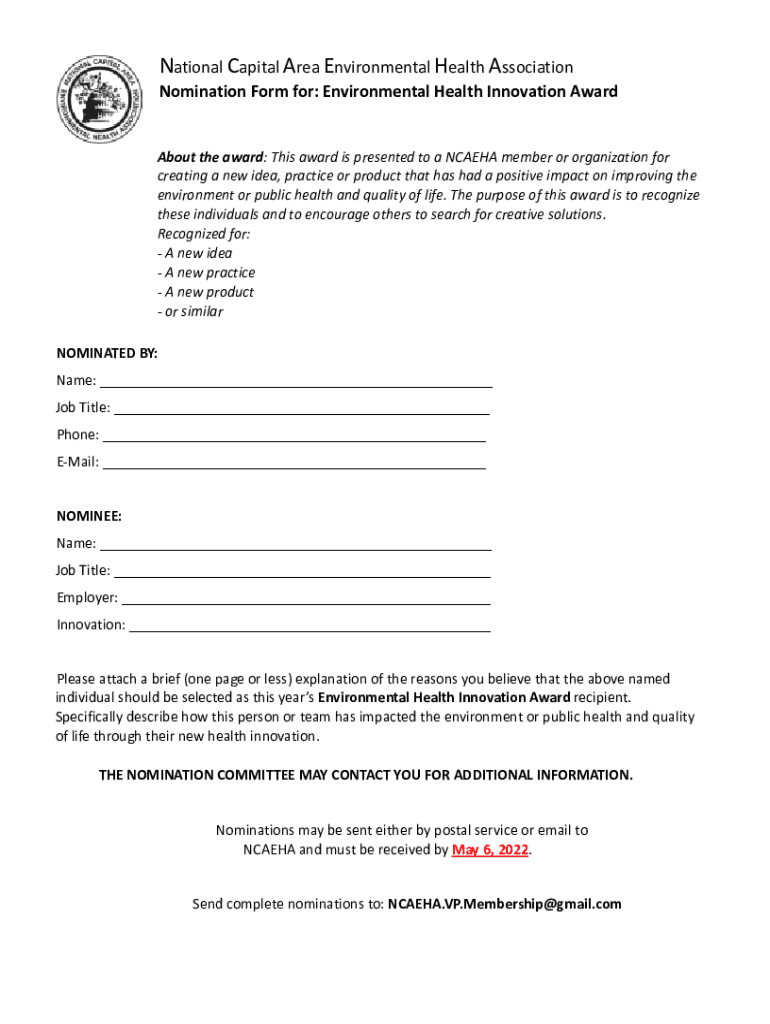 Get the free Nomination Form for: Environmental Health Innovation Award