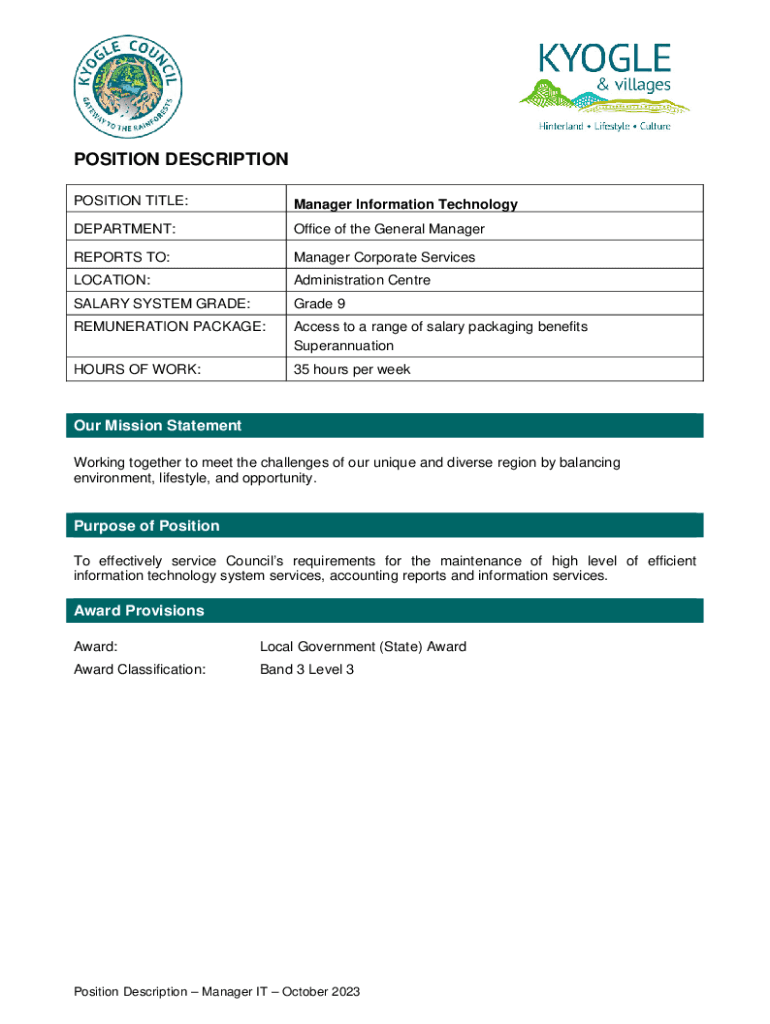 POSITION DESCRIPTION POSITION TITLE:Manager Information TechnologyDEPARTMENT:Office of the General ManagerREPORTS TO:Manager Corporate ServicesLOCATION:Administration CentreSALARY SYSTEM GRADE:Grade