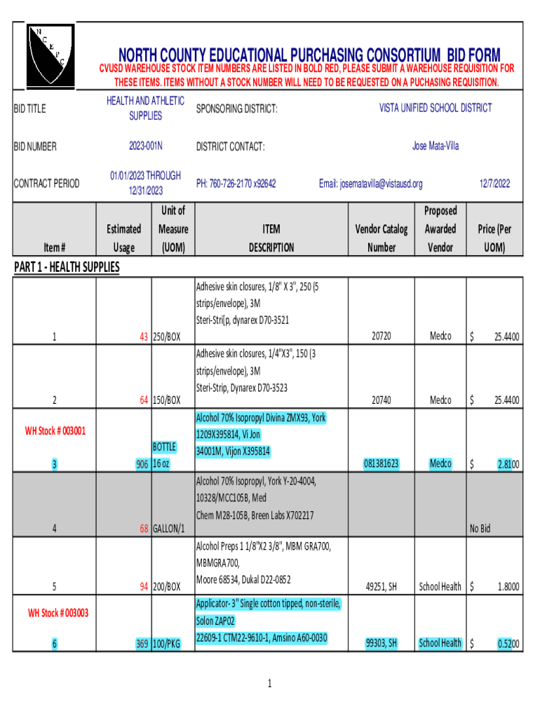 NORTH COUNTY EDUCATIONAL PURCHASING CONSORTIUM BID FORMCVUSD WAREHOUSE STOCK ITEM NUMBERS ARE LISTED IN BOLD RED, PLEASE SUBMIT A WAREHOUSE REQUISITION FOR THESE ITEMS. ITEMS WITHOUT A STOCK NUMBER