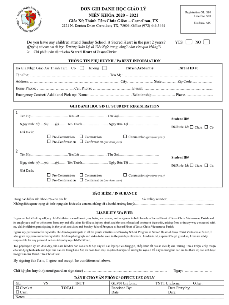 N GHI DANH HC GIO L NIN KHA 2020 2021Registration GL: $90 Late Fee: $20Gio X Thnh Tm Cha Gisu Carrollton, TXUniform: $152121 N. Denton Drive Carrollton, TX, 75006. Office (972) 4463461Do you have