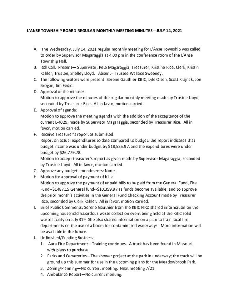 LANSE TOWNSHIP BOARD REGULAR MONTHLY MEETING MINUTESJULY 14, 2021A. The Wednesday, July 14, 2021 regular monthly meeting for LAnse Township was called to order by Supervisor Magaraggia at 4:00 pm