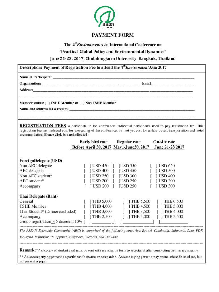 PAYMENT FORM The 4thEnvironmentAsia International Conference on Practical Global Policy and Environmental Dynamics June 2123, 2017, Chulalongkorn University, Bangkok, Thailand Description: Payment