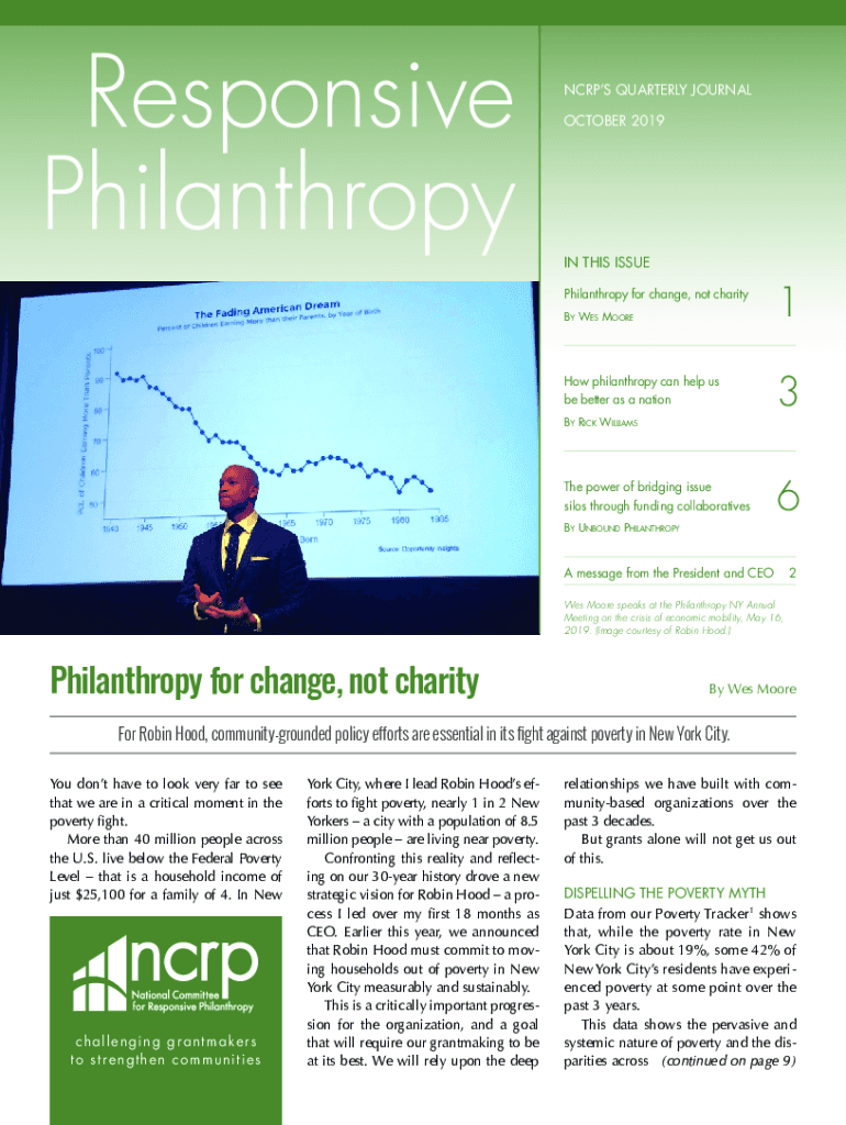 Responsive PhilanthropyNCRPS QUARTERLY JOURNAL OCTOBER 2019IN THIS ISSUE Philanthropy for change, not charity By Wes MooreHow philanthropy can help us be better as a nation By Rick WilliamsThe power