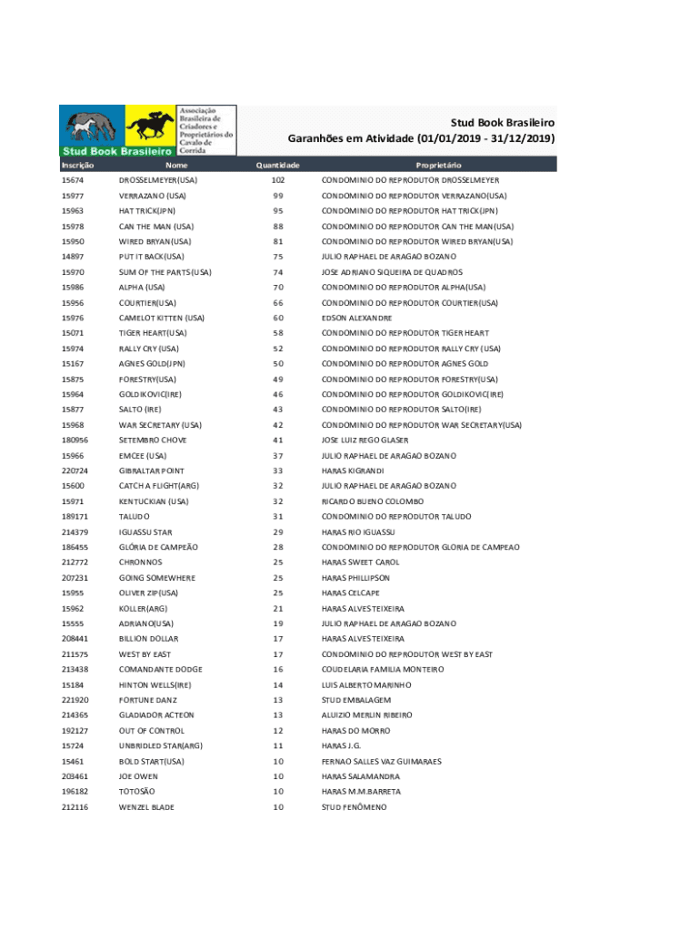 Stud Book Brasileiro Garanhes em Atividade (01/01/2019 31/12/2019) InscrioNomeQuantidadeProprietrio15674DROSSELMEYER(USA)102CONDOMINIO DO REPRODUTOR DROSSELMEYER15977VERRAZANO (USA)99CONDOMINIO DO
