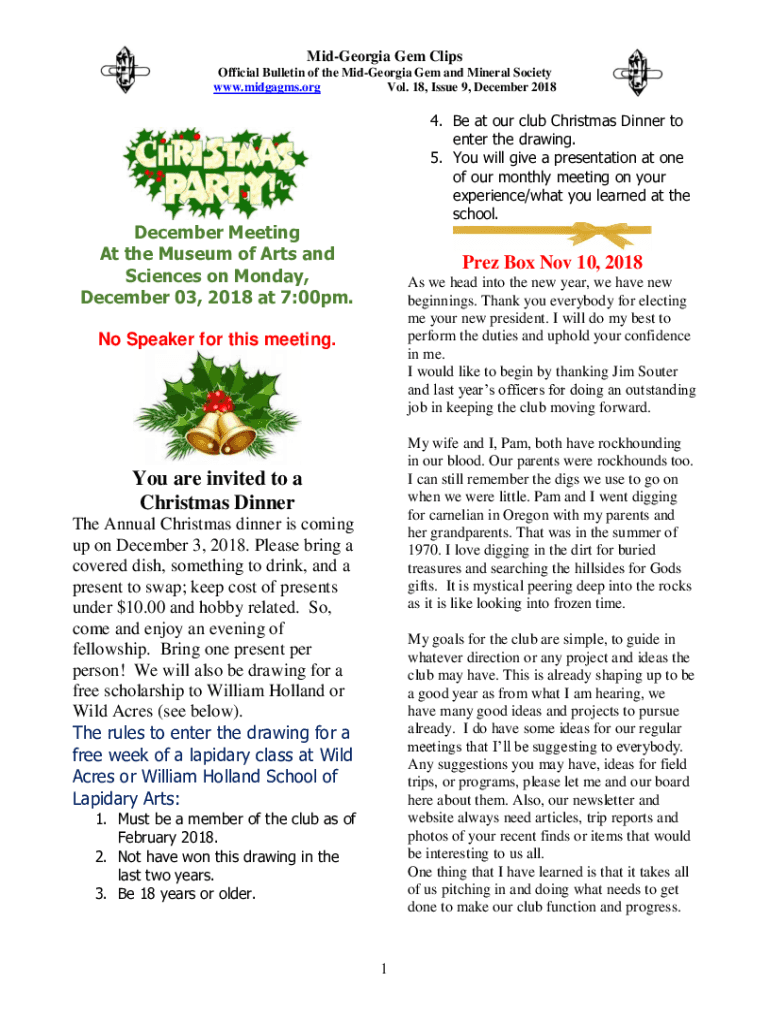 MidGeorgia Gem Clips Official Bulletin of the MidGeorgia Gem and Mineral Society www.midgagms.org Vol. 18, Issue 9, December 20184. Be at our club Christmas Dinner to enter the drawing. 5. You will
