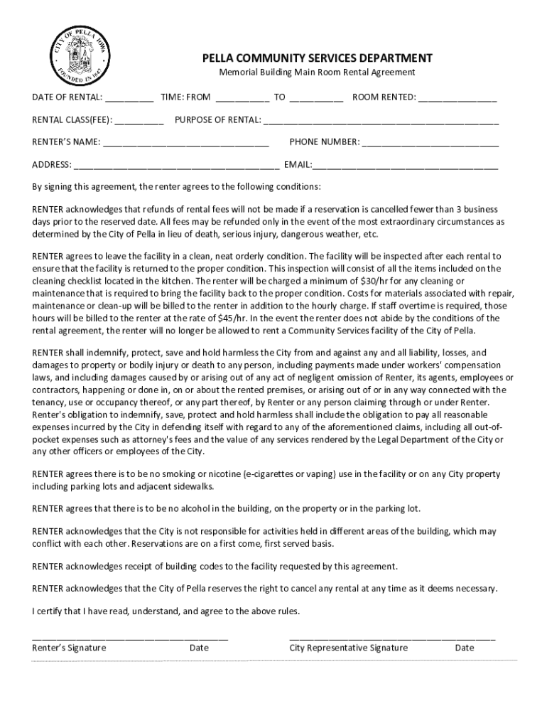 PELLA COMMUNITY SERVICES DEPARTMENT Memorial Building Main Room Rental Agreement DATE OF RENTAL: ___ TIME: FROM ___ TO ___ ROOM RENTED: ___ RENTAL CLASS(FEE): ___PURPOSE OF RENTAL: ___RENTERS NAME: