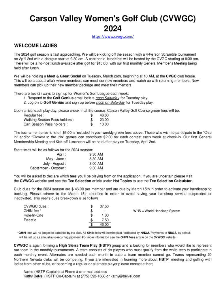 Carson Valley Women\'s Golf Club (CVWGC) 2024 https://www.cvwgc.com/WELCOME LADIES The 2024 golf season is fast approaching. We will be kicking off the season with a 4Person Scramble tournament on
