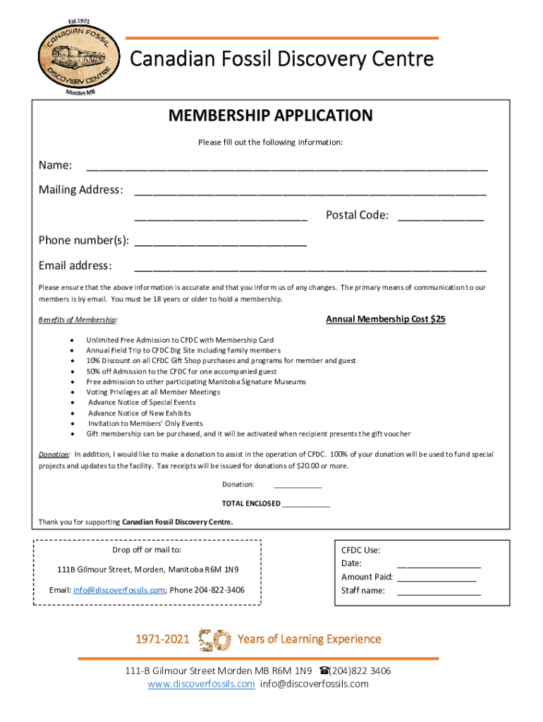 Canadian Fossil Discovery Centre MEMBERSHIP APPLICATION Please fill out the following information:Name:___Mailing Address: ___ ___Postal Code: ___Phone number(s): ___ Email address:___Please ensure