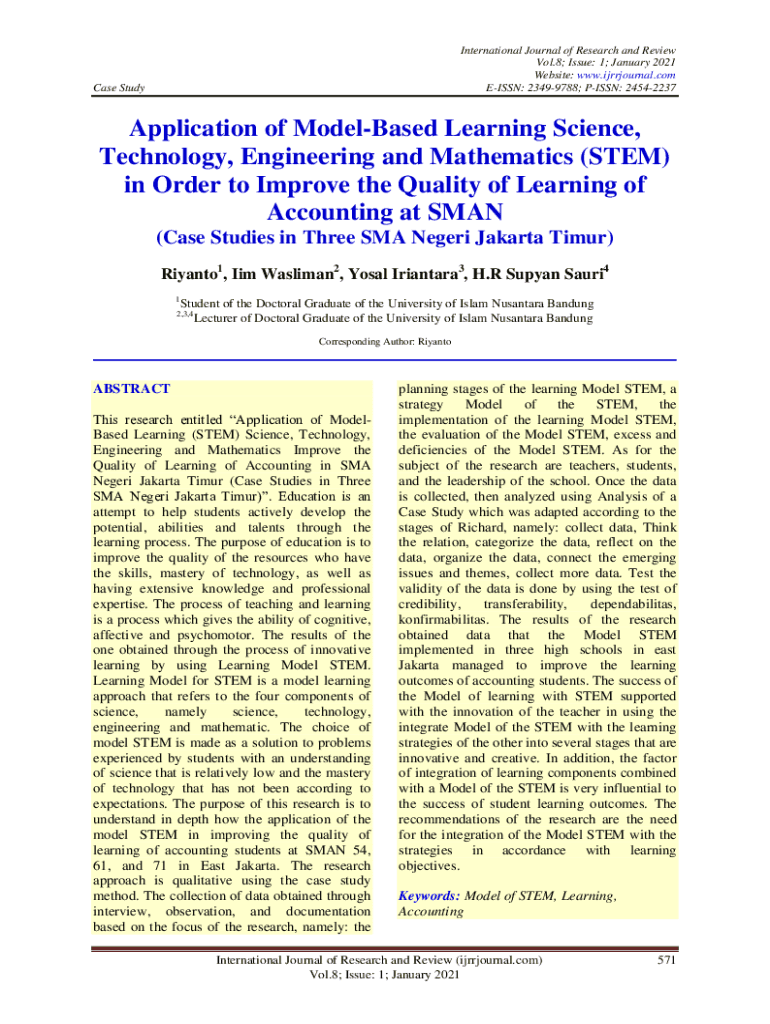 International Journal of Research and Review Vol.8; Issue: 1; January 2021 Website: www.ijrrjournal.com EISSN: 23499788; PISSN: 24542237Case StudyApplication of ModelBased Learning Science, Technology,