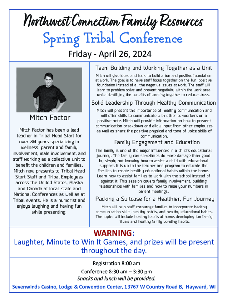 Northwest Connection Family Resources Spring Tribal Conference Friday April 26, 2024Team Building and Working Together as a Unit Mitch will give ideas and tools to build a fun and positive foundation